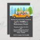 Venha celebrar a última parada do motorista de ônibus e chute sua aposentadoria! Este design branco bonito apresenta um ônibus escolar amarelo com corujas. Árvores verdes e azuis alinham o fundo. Personalize este convite para a festa de aposentadoria de um motorista de ônibus. Há também muito espaço no verso para mais informações, fotos, uma breve descrição de seus anos de serviço dedicado e comprometido. Este convite também funciona bem para uma aposentadoria de professores, ou para o aniversário de uma criança com um tema de ônibus.