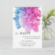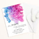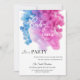 Um modelo de convite editável para uma festa de Revolução de Gênero para bebês. Num fundo branco, uma elegante fumaça azul e rosa envolve o sobrenome do bebê escrito em texto tipográfico branco. Personalize adicionando seu evento de cheio e os detalhes de contato à frente e atrás.