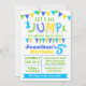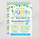Convite de aniversário de salto, esquema de cor azul, verde e amarelo adequado para qualquer idade. Adicione seu próprio texto ao modelo, para mais personalização (cor da fonte, estilo da fonte, plano de fundo), clique em personalizar, role para baixo e clique no link "clique para personalizar ainda mais".