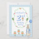 Coelho Coelho Bonito convite de festas Azul segundo aniversário com bolos de cenoura e balões. Moldura de xadrez azul e branca com sotaque de cenoura e rabanete. Perfeito para o coelho mais doce da primeira festa de aniversário.