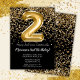 Convite de festas preto e segundo aniversário de ouro elegante para uma menina de 2 anos com roteiro elegante escrevendo e balões de folhas divertidas.