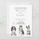 Seu filho está fazendo dois anos! Convide seus convidados especiais com este adorável convite que inclui cachorros-aquosos pintados à mão, em azul, preto e branco. O nome do bebê, "Turning Two" e a data estão em tipografia de script com letras azuis, e personalizada em um sans negro moderno, sans serif. A parte traseira da placa apresenta um design de verificação giro, preto e branco, desenhado à mão. Copyright Elegant Invites, todos os direitos reservados.