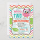 Coruja engraçada, coruja primavera com cores temáticas crianças, convite para festas de aniversário de meninas em um padrão giro colorido brilhante. Possui coruja rosa e folha verde, com padrão feminino, em faixas laranja, verde limão, lacre, coral, branco e chevron aqua. "DOIS" e segundos aniversários podem ser personalizados para outros aniversários para bebês, crianças, ou bebês, bebê.