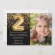 Convite de festas de segundo aniversário preto e dourado para uma menina de 2 anos com script elegante escrevendo o design de fonte dourada e balões de folha divertida.