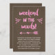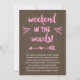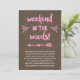 Este bonito, convite do rústico-chique para uma festa de solteira "glamping" em uma cabine caracteriza uma caligrafia bonito do roteiro da escova que leia o "fim de semana nas madeiras!" O design igualmente inclui um coração e uma seta, flourishes bonito, brilho do rosa do falso, e um fundo de madeira da textura.