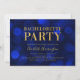 Convite para festa de solteira de microfone com as palavras "Festa de solteira" em folha de ouro falsa contra um fundo padrão de luzes azul-sapphire. O convite tem um fundo azul colorido atrás. Personalize este convite com seus detalhes substituindo o texto do marcador de posição. Para obter mais opções, como alterar a fonte, o tamanho/cor do texto ou o espaçamento entre letras, clique no botão "Personalizar". *Observe que a Marca d'água do Zazzle que aparece na visualização de zoom NÃO aparecerá no produto impresso final. © Rosewood e Citrus