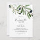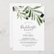 Este convite à festa de solteira de oliveiras moderno é perfeito para um boho-damas noturno. O design rústico, porém elegante, apresenta folhas botânicas de cor aquática simples e azeitonas pretas num pequeno galho com um toque mediterrânico clássico.