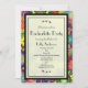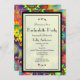 Uma explosão de formas de flores de deco de arte e rodas girantes em muitas cores vibrantes e excitantes. Muitas formas e padrões diferentes, com pétalas e círculos, e mais sobreposições nesta nova arte, um padrão ornamental estilhaçado. Uma variedade de cores brilhantes e arrojadas dá a este padrão entusiasmo e diversão que está explodindo com a vida. As cores dominantes são verde limão vívido, laranja de explosão solar, azul de turquesa, tangerina e vermelho de burgundy. Uma armação em borda negra com um centro esbranquiçado é colocada no meio do convite com uma longa ilustração de rosa vermelha empilhada colocada no topo e na parte inferior da armação.