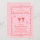 Trendy, convite de festa de solteira rosa e vermelho inspirado na trendy, com um quadro ondulado adornado com arcos coquetes, ilustrações feitas à mão branca de corações e coquetéis margarita. "Festa de solteira" e o nome da noiva são mostrados em um roteiro divertido e divertido.