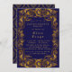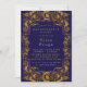 Design apresenta um design de art nouveau em tons de col alt azul e ouro floresce em um pano de fundo azul. Caligrafia ou tipo escrevendo com o trabalho de arte de design. Na parte de trás das cartas estão cores damasco azuis reais e douradas. Esta é uma coleção de mistura e combinação. Excelente para as comemorações do casamento!