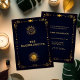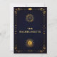 Um modelo de convite para festas de solteira moderno, elegante e chic com um tema de tarô, vidente, com fundo de marinho, um quadro deco com elementos de tarô: sol, lua, cálice etc. e uma camada de ouro (é um efeito digital, não uma folha real). Uma design de solteira de tarô divertida para uma noiva moderna. Uma escolha encantadora para uma festa divertida de leitura de palma, contar a fortuna, olhar para o horóscopo e outras atividades divertidas e místicas com as meninas, antes do grande dia.
