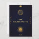 Um modelo de convite para festas de solteira moderno, elegante e chic com um tema de tarô, vidente, com elementos azul escuro, índio e tarô: sol, lua, cálice etc. e uma camada de ouro (é um efeito digital, não uma folha real). Uma design de solteira de tarô divertida para uma noiva moderna. Uma escolha encantadora para uma festa divertida de leitura de palma, contar a fortuna, olhar para o horóscopo e outras atividades divertidas e místicas com as meninas, antes do grande dia.