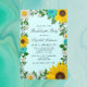 Convite russo à festa de solteira, com girassóis vibrantes, margaridas brancas tradicionais e flores lacrimogêneas contra um fundo aquoso leve com sopro de bebê e sotaques botânicos verdes