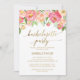 Este cartão de convite para festas de solteira de flores de pêssego e rosa é perfeito para um evento elegante. O design floral apresenta um belo arranjo de peônias de aquarela em tons de blush e coral, combinado com uma caligrafia de folha de ouro afiada. Nota: Este design não apresenta folha de ouro real. É um gráfico de alta qualidade feito para se parecer com folhas de ouro.