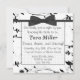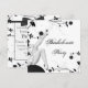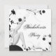 Uma noite de despedida de solteira com um alfinete preto-e-branco em mini vestido e saltos altos cercados por florais e vinhas pretas. Uma fita preta e um arco no verso.