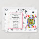 Rainha do cassino de corações, o convite de festa de solteira temático feito em branco com gráficos de cartas de jogar ao fundo e uma carta da Rainha do Coração no lado direito. Uma área de texto em formato vermelho tem texto preto personalizado pronto para personalizar, de acordo com as necessidades do seu partido.