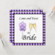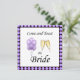 Venha brindar à Noiva com balões roxos e óculos de champanhe na frente. Balões e todas as informações para o seu evento no verso deste bonito convite roxo.