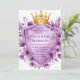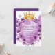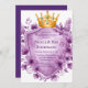 Este belo modelo de convite para casamento apresenta uma coroa ouro real adornada com joias ametistas, aninhada sobre um escudo heráldico embrulhado em ouro. Ao redor do design são lavandas exuberantes e peônias violetas, criando um luxuoso e vintage motif floral. Perfeito para casamentos românticos, reais ou celebrações elegantes com um toque de nobreza e encanto floral. A blindagem de vazio oferece espaço para nomes, datas ou mensagens personalizados.