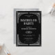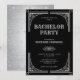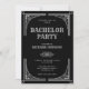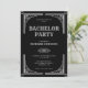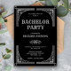Convide seus convidados com este convite de festa de solteiro vintage tema O Grande Gatsby, apresentando uma borda decorativa prateada com tipografia elegante contra um fundo preto. Basta adicionar os detalhes do seu evento neste modelo fácil de usar para torná-lo um convite único. Vire o cartão para revelar um lindo padrão de estrelas prateadas no verso do cartão.