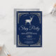 Deslumbre seus convidados com este convite de festa de solteiro sofisticado, apresentando uma borda ornamentada prateada e um cervo elegante com tipografia estilosa contra um fundo azul. Basta adicionar os detalhes do seu evento neste modelo fácil de usar para torná-lo um convite único. Vire o cartão para revelar um belo padrão de estrelas prateadas no verso do cartão.