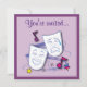 As máscaras de comédia e tragédia decoram este convite para uma festa de aniversário de teatro. Para combinar itens, digite "máscaras de loja de penguincornerstore" no bar de pesquisa Zazzle.