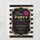 Convite de festas. Design branco preto elegante com ouro brilhante. Apresenta lábios cor-de-rosa beijando, listras brancas pretas, confetti e fonte de script. Perfeito para uma comemoração de na moda. Envie-me uma mensagem se precisar de mais personalização.