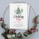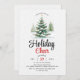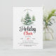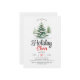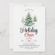 Convite de festas de torcida das árvores de Natal. Mostra uma paisagem de inverno pitoresca adornada com árvores cobertas de neve, cada uma embelezada com Enfeites de natal vibrantes. Destaque é a frase "Cheer de Férias", convidando convidados a participar das festividades sazonais. O pano de fundo é delicadamente aspergido com flocos de neve de cinza macia, melhorando a atmosfera de inverno encantadora.