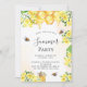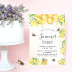 Um convite de festas de verão com fundo branco e ouro aquoso. Decorados com espécimes do gênero Bombus, melando mel e favos de mel com flores amarelas, flores e um pote de mel. Personalize e adicione um nome e detalhes da parte. Ouro e letras pretas. Perfeito para uma festa de verão ou outono