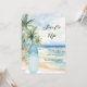 Um convite para uma festa de praia de verão. Uma praia arenosa de cor aquática, ondas oceânicas e palmeiras como fundo, e uma prancha azul na praia.