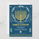 Façam Chanukah especial e comemorem com a família e amigos com este convite de festas decorativo de Chanukah. Uma menorah dourada é cercada por folhas, estrelas e espirais contra um rico fundo azul. Disponível com produtos correspondentes.