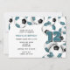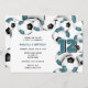 Este convite de festas de futebol bonito apresenta bolas de futebol preto e branco organizadas aleatoriamente nas bordas direita e superior da frente e cobrindo a parte posterior do convite - personalize os detalhes da festa em um fundo branco - por katz_d_zynes