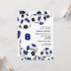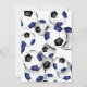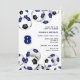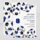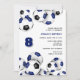 Este convite de festas de tema de futebol bonito apresenta clusters de bolas de futebol azuis, pretas e brancas nas bordas superior e inferior na frente e um cluster de solteiros que cobre a parte posterior do convite - personalize os detalhes da parte em um fundo branco - por katz_d_zynes