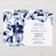 Este convite de festas temático de vôlei tem volichões azuis, azuis-claros e brancos agrupados nas bordas esquerda e superior na frente e um cluster de solteiros que cobre a parte de trás do convite - personalize os detalhes do partido na coordenação de cores em fundo branco - por katz_d_zynes
