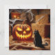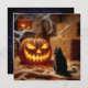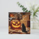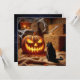 Um gato preto se senta ao lado de uma abóbora esculpida brilhante com um rosto assustador criando uma atmosfera estranha. Todo o texto pode ser alterado.