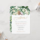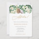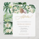 Folhagem verde-luxuosa, agrupada com orquídeas brancas de cor aquosa, abacaxi e coco para um Chá de panela inspirado no luau, com uma vibração de ponta. Em vez disso, você pode colocar o impressão onça-pintada no verso das cartas digitando a ferramenta design (abaixo das caixas de texto, "clique para personalizar mais") e, em seguida, vá para o verso e exclua ou oculta a camada de folhas tropicais.