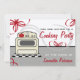 Um convite de festas cozinhar com um fogão retrô com um pote vermelho sentado no canto esquerdo frontal. Stove está num andar preto e branco. Cinzas de fundo com flores vermelhas ao redor. Personalize o lado traseiro correspondente com menu e detalhes.