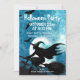Convite de Halloween, com uma silhueta de bruxas pretas cativante, voa sobre a vassoura, rodeada por morcegos contra o pano de fundo de uma noite reluzente e lua