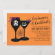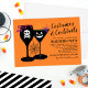 Os convites para na moda definem o tom para uma fantasia de Halloween adulta e festa de cocktail! O convite apresenta vinho negro e óculos martini com ossos brancos crânio-e-cruzados e designs de estêncil jack o'lantern, cheios de misturas tóxicas, e acentuados com detalhes assustadores de cobra, aranha e teia aranha. A cor de fundo laranja pode ser personalizada. A parte traseira da placa apresenta um padrão moderno de faixas diagonais preto e branco.