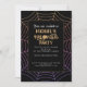 Personalize o convite de Hallow com o padrão de Dia das Bruxas da aranha de laranja roxa em preto. Com texto branco personalizado.