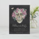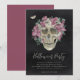 Um convite para festas de Dia das Bruxas chique assustador com uma ilustração do crânio floral, tocado com flores cor d'água cor-de-rosa num fundo preto-enfumaçado. Personalize este convite exclusivo e elegante da festa do Dia das Bruxas com os detalhes do seu evento em letras brancas.