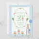 Segundo aniversário verde de coelho coelho bonito com convite de festas com bolos de cenoura e balões. Moldura de xadrez azul e branca com sotaques de cenouras e rabanetes. Perfeito para o coelho mais doce da primeira festa de aniversário. Aniversário de garotinha.