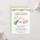 Este convite de festas personalizado apresenta o tema do Taco Night Mexicano. Imagens em estilo aquoso de uma guitarra mexicana, maracas, pimentões chili e um taco são colocadas através do centro. Um banner colorido é pendurado na parte superior.