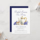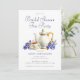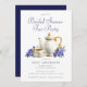 Um elegante convite de festas de chá chá de panela floral de aquarela que pode ser personalizado com a inclusão dos detalhes do seu chá de panela. O convite apresenta um elegante bule de aquarela, xícara e pires cercado por um belo arranjo floral azul. O design é elegante e moderno.