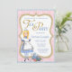 Convite de festas de chá da Terra Maravilha com Alice e chá bonitinho em uma bonito damasco rosa e fundo azul. Este bonito convite de festas de chá de Wonderland, cor-de-rosa, azul e dourado, é facilmente personalizado para o seu evento, simplesmente adicionando os seus detalhes no estilo de letra e na cor da sua escolha. Este é um design impresso sem brilho real.