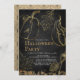 Este cartão de convite para festas chic e elegante do Dia das Bruxas apresenta um fundo preto com abóboras e folhas em ouro falso/falso. O verso apresenta um fundo dourado falso/falso com padrões geométricos a preto. Personalize-o para as suas necessidades. Você pode encontrar produtos correspondentes na minha loja.