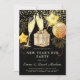 Um convite de véspera de Ano Novo moderno, com óculos de champanhe, balões e brilho com explosões de fogos de artifício em fundo negro. Folha de ouro falsa de Platina no verso do convite.