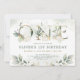 Este elegante convite para o primeiro aniversário com tema abóbora apresenta lindas folhas de cor aquosa verde em verde macio e ouro e tipografia moderna