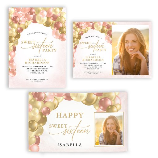 Este elegante convite de festas 16 apresenta um gráfico de um arco de balão nas cores de rosa, rosa e ouro. O design é acentuado com texto de script.