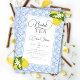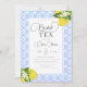 Um convite de chá para festas de chá de noiva com limões amarelos, desenhados à mão em aquarela e um padrão de azulejos azuis inspirado nas tradições mediterrânicas. Personalize-o com o nome, a data, a hora e todos os detalhes. Caligrafia moderna pelo nome da noiva.