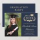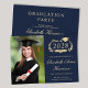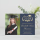 Formandos azul escuro moderno, anúncio e convite de festas com "Classe de" dentro de uma coroa de louros, um boné de formando e um diploma, uma foto do formando e seu nome em um roteiro elegante de ouro claro. Acrescente sua escola, major, honras, planos futuros, etc., na tipografia de ouro leve moderna. No verso, adicione os detalhes da parte.